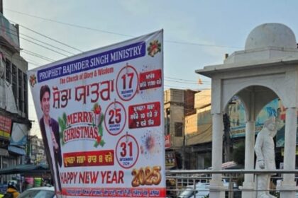शहीद भगत सिंह की प्रतिमा के आगे प्रोपेट बरजिंदर सिंह मिनिस्ट्री ने लगाया बोर्ड, लोगों में रोष