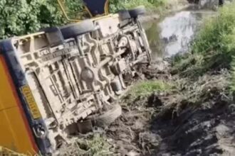 स्कूल खुलते ही पटियाला में बच्चों से भरी बस पलटी:रास्ता खराब होने के कारण नाले में जा गिरी; 20 स्टूडेंट्स सुरक्षित निकाले