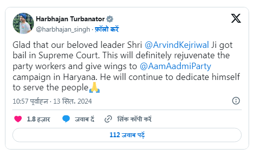 पूर्व क्रिकेटर एवं आप के राज्यसभा सांसद हरभजन सिंह ने भी फैसले का स्वागत करते हुए एक्स पर कहा कि केजरीवाल को जमानत मिलने की खबर सुनकर खुशी हुई। इससे पार्टी कार्यकर्ताओं में जोश पैदा होगा और पार्टी के हरियाणा चुनाव अभियान को बल मिलेगा।