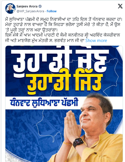 संजीव अरोड़ा ने ट्वीट किया, “मैं लुधियाना पश्चिम के सभी निवासियों का तह दिल से धन्यवाद करता हूं, मैं आपसे वादा करता हूंकि आपने मुझ पर जो भरोसा जताया है, मैं उस पर पूरी तरह खरा उतरूंगा। इस अवसर पर मैं आम आदमी पार्टी के राष्ट्रीय संयोजक अरविंद केजरीवाल जी और माननीय मुख्यमंत्री भगवंत मान जी का भी धन्यवाद करता हूं कि उन्होंने मुझे यह सेवा करने का अवसर दिया। आपका बहुत-बहुत धन्यवाद, यह आपकी जीत है।”