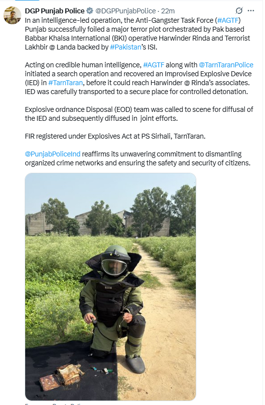 तरनतारन (द पंजाब प्लस) एंटी-गैंगस्टर टास्क फोर्स (AGTF) ने तरनतारन जिले में एक बड़ी आतंकी साजिश को नाकाम कर दिया है। पंजाब के DGP गौरव यादव ने बताया कि यह साजिश पाकिस्तान स्थित बब्बर खालसा इंटरनेशनल के आतंकवादी हरविंदर रिंदा और पाकिस्तान की ISI समर्थित आतंकवादी लखबीर उर्फ लांडा ने रची थी, जिसे पाकिस्तान की ISI का पूरा समर्थन मिल रहा था।