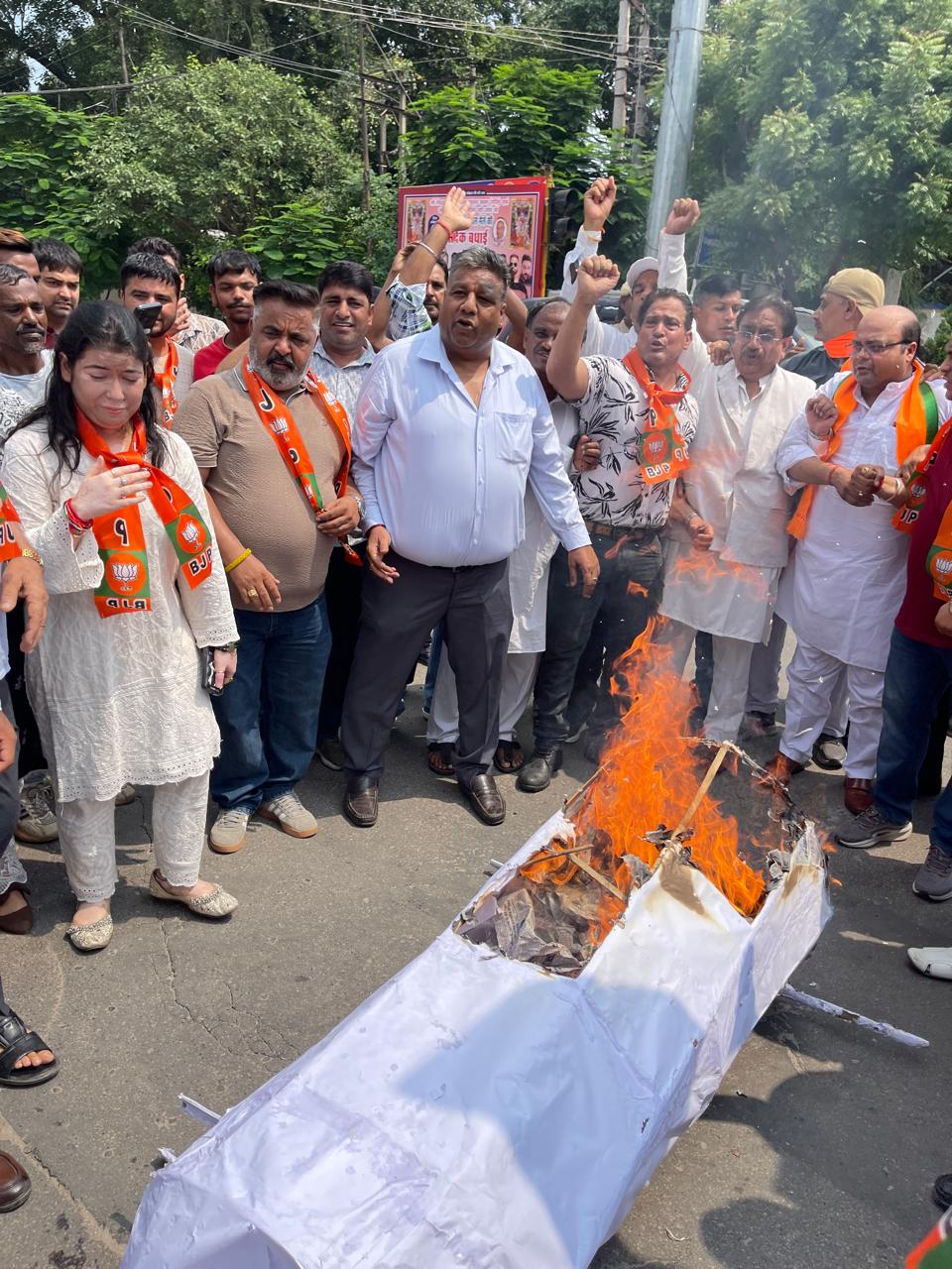 जालंधर (दीपक पंडित) जालंधर के पूर्व मेयर एवं भाजपा पंजाब प्रदेश के महामंत्री राकेश राठौर के नेतृत्व और भाजपा जिला जालंधर के अध्यक्ष सुशील शर्मा की अध्यक्षता में आम आदमी पार्टी की सरकार का पुतला फूंक कर जोरदार प्रदर्शन किया गया। यह प्रदर्शन जालंधर के पूर्व सांसद सुशील कुमार रिंकू एवं पूर्व संसदीय सचिव भाजपा प्रदेश उपाध्यक्ष कृष्ण देव भंडारी और प्रदेश के सभी भाजपा नेताओं पर पंजाब पुलिस के पक्षपात रवैया और सरकार के दबाव में जो गिरफ्तारीया की जा रही है उसके खिलाफ पूरे जालंधर में यह प्रदर्शन किया गया राकेश राठौर ने कहा कि पंजाब सरकार केंद्र सरकार द्वारा चलाई जा रही जनकल्याणकारी योजनाओं जो कि लोगों के लिए चलाई जा रही हैं उसके कैंपों को रोक कर लोकतांत्रिक परंपराओं का गला घोट रही है और विपक्ष की आवाज को दबाने का प्रयास कर रही है राठौर ने कहा कि भाजपा कार्यकर्ताओं एवं पदाधिकारीयो की गिरफ्तारी पूरी तरह से अलोकतांत्रिक कदम है और इसे किसी भी सूरत में बर्दाश्त नहीं किया जाएगा उन्होंने कहा कि दिल्ली में आम आदमी पार्टी की हार के बाद आम आदमी पार्टी बौखला गई है और अब पंजाब में पुलिस का इस्तेमाल कर भाजपा की प्रदेश में बढ़ती लोकप्रियता को रोकने की कोशिश कर रही है।