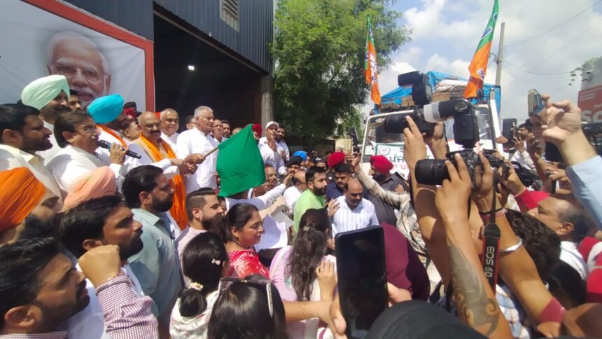 जालंधर (दीपक पंडित) आज भाजपा जिला जालंधर के अध्यक्ष सुशील शर्मा की अध्यक्षता में भाजपा पंजाब प्रदेश के अध्यक्ष सुनील जाखड़ ,कार्यकारी अध्यक्ष अश्विनी शर्मा, केंद्रीय रेल राज्य मंत्री रवनीत सिंह बिट्टू, के नेतृत्व में पंजाब में बाढ़ की भीषण स्थिति को देखते हुए, भाजपा ने राज्य के सभी बाढ़ प्रभावित इलाकों में राहत सामग्री ट्रैकों में भरकर भेजी । इस राहत सामग्री में राशन , पानी की बोतलें, कपड़े, कंबल, तिरपाल, बर्तन, मच्छरदानी, फोल्डिंग बेड,और अन्य आवश्यक सामग्री शामिल हैं।