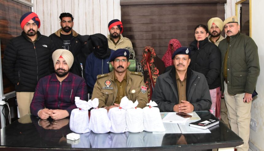 जालंधर (दीपक पंडित) पुलिस कमिश्नर स्वपन शर्मा के नेतृत्व में जालंधर कमिश्नरेट पुलिस ने एक बड़ी सफलता हासिल करते हुए 5 किलो अफीम के साथ तीन महिलाओं सहित पांच प्रवासी ड्रग तस्करों को गिरफ्तार किया है। इस संबंध में जानकारी देते हुए पुलिस कमिश्नर ने बताया कि पुलिस को गुप्त सूचना मिली थी कि शहर में तस्करों का एक गिरोह सक्रिय है।उन्होंने बताया कि सूचना के आधार पर पुलिस पार्टी ने बुधवार को बाबा बुड्ढा फ्लाईओवर पर जाल बिछाया, इस सम्बन्ध में स्वपन शर्मा ने बताया कि पुलिस पार्टी ने कपूरथला रोड की तरफ से तीन महिलाओं सहित पांच लोगों को आते देखा। पुलिस आयुक्त ने कहा कि गिरोह के पुरुष सदस्यों ने पुलिस पार्टी को देखकर संदिग्ध हरकतें कीं।