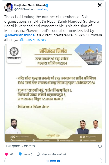 शिरोमणि गुरुद्वारा प्रबंधक कमेटी के प्रधान महाराष्ट्र मंत्रिमंडल के इस फैसले को लेकर अपनी आपत्ति जताते हुए सरकार को एक पत्र भी लिखा है। SGPC के प्रधान हरजिंदर सिंह धामी ने कहा कि श्री हजूर साहिब नांदेड़ गुरुद्वारा बोर्ड में सिख संगठनों के सदस्यों की संख्या सीमित करने का कार्य अत्यंत दुखद एवं निंदनीय है।